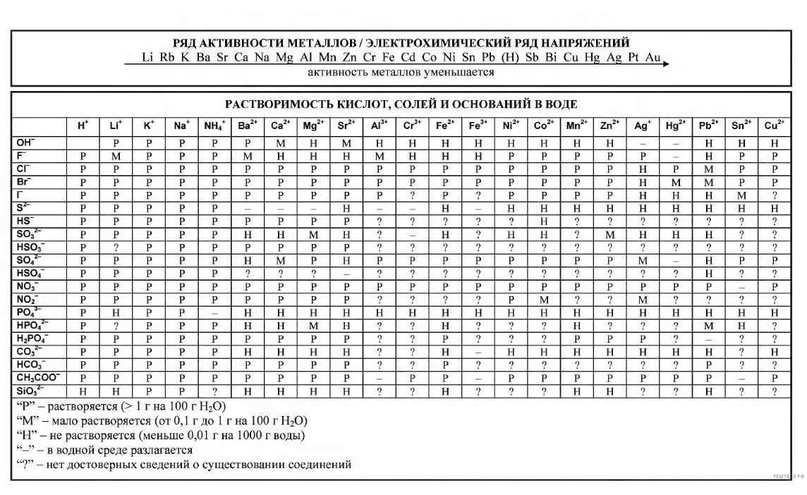 Таблица менделеева, таблица растворимости и ряд активности металлов.